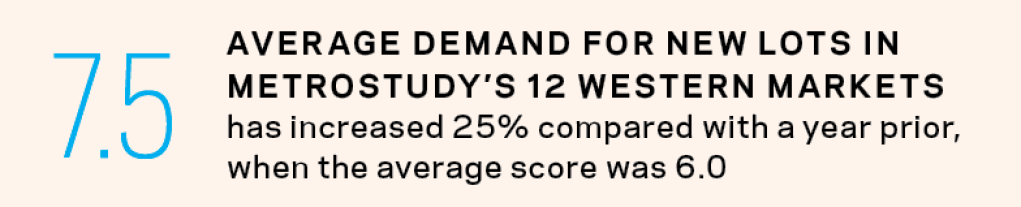 Builders in certain U.S. regions are worse off than others. The average lot demand score for Metrostudy’s 12 western markets (7.5) is higher than any other region and has increased 25% since May 2015. Demand for new building lots is also high in southern