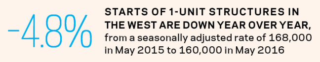 According to May new residential construction data, 1-unit starts increased in every region except for the West (-4.8%) year over year. The region’s significant decrease in new-home construction activity, paired with the “very low” supply of lots reported by builders, suggests that lot supply is now so tight that it will hinder further growth and