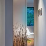 Designed as a modernist take on a treehouse, the home is crafted with simple lines, down-to-earth materials, and muted colors accented by unique touches such as stair treads from Enviroglas, made from recycled brown glass and porcelain from old toilets. A two-story window wall continues the indoor/outdoor theme and floods the front of the home with daylight.