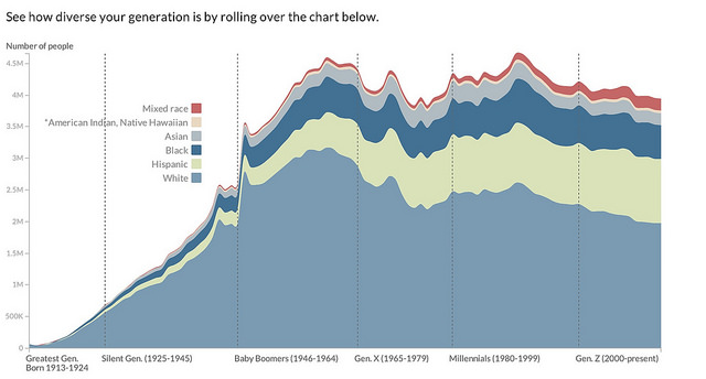 There are 76 million baby boomers, and 72% of them are white. The millennials are an even larger group with 87 million, but much more diverse-only 56% are white. This interactive allows everyone to see how diverse each generation is.