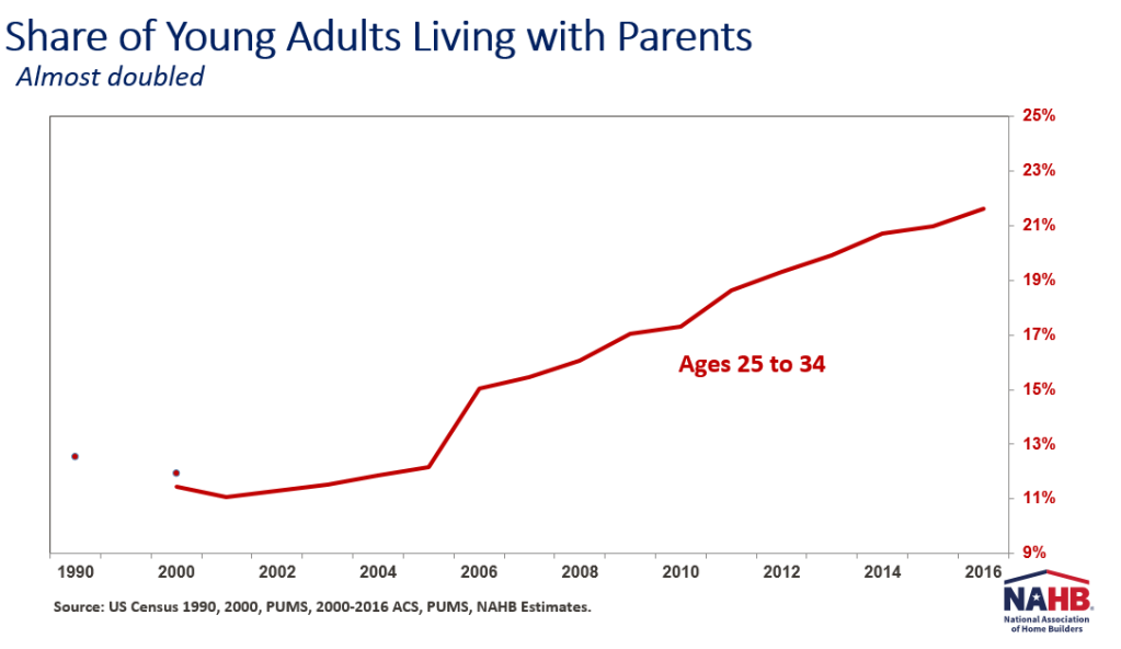 So where are these missing households? Some are found literally at home—their parents’ homes. NAHB research shows the share of young adults aged 25 to 34 has nearly doubled over the past decade and a half. In 2000, a little more than 11% of individuals in this age range lived with their parents. The share increased during the recession, as the unemployment rate increased. However, the rate continued to rise in recent years despite more solid economic conditions—in 2016, the rate increased to almost 22%. This change in living conditions, which is likely connected to the rise in student loans, reduced cumulative household formation by several million from 2012 to 2017 and transformed many older parents into implicit landlords.