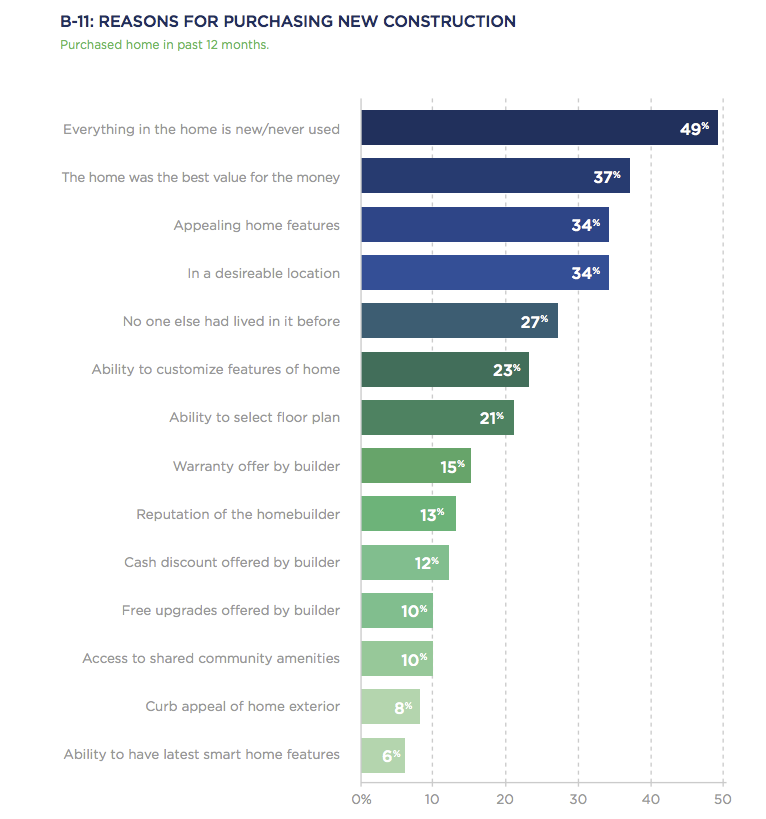 The study found that many new construction buyers are drawn to the concept of a home’s “newness” and the peace of mind that comes from knowing that the appliances and other features of the home have not been previously used. In fact, around half of buyers said everything in the home being new was the top reason they purchased a new construction home. More than a third said they purchased a new construction home because it was the best value for their money, and 34% said the appealing features of a new construction home were the top draws. The least important factors were access to shared community amenities (10%), curb appeal of the home’s exterior (8%), and having the latest smart home features (6%).