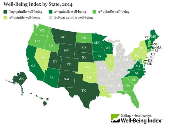 The Gallup-Healthways Well-Being Index ranks states based on five factors pertaining to overall resident well-being including purpose, social, physical, financial, and community. The 10 highest states are predominantly concentrated in the Mountain region and the lowest in the Midwest.