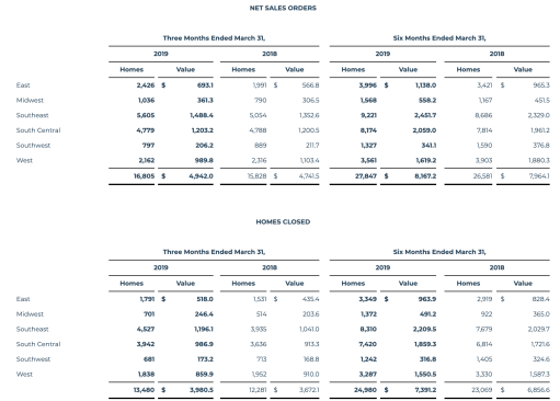 Net sales orders for the second quarter ended March 31, 2019 increased 6% to 16,805 homes and 4% in value to $4.9 billion compared to 15,828 homes and $4.7 billion in the same quarter of the prior year. Excluding the effects of recent acquisitions, the company’s second quarter net sales orders increased 3% from the prior year quarter. The company’s cancellation rate for the second quarter of fiscal 2019 was 19%, consistent with the prior year quarter. Net sales orders for the first six months of fiscal 2019 increased 5% to 27,847 homes and 3% in value to $8.2 billion compared to 26,581 homes and $8.0 billion in the same period of fiscal 2018.