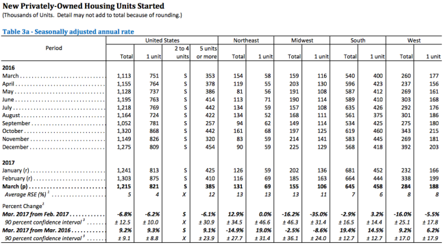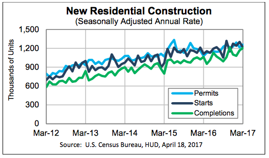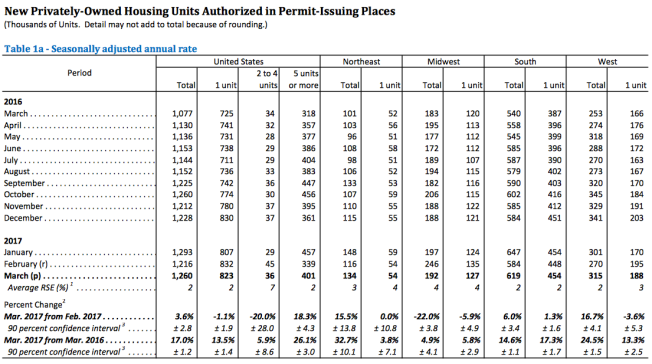 Permits in March were at a seasonally adjusted annual rate of 1,260,000, 3.6% above the revised February rate of 1,216,000 and 17.0% above the March 2016 rate of 1,077,000. Single-family authorizations in March were at a rate of 823,000, 1.1% below the revised February figure of 832,000 and 13.5% ahead of a year earlier. Authorizations of units in buildings with five units or more were at a rate of 401,000 in March, up 18.3% sequentially and 26.1% year-over-year.