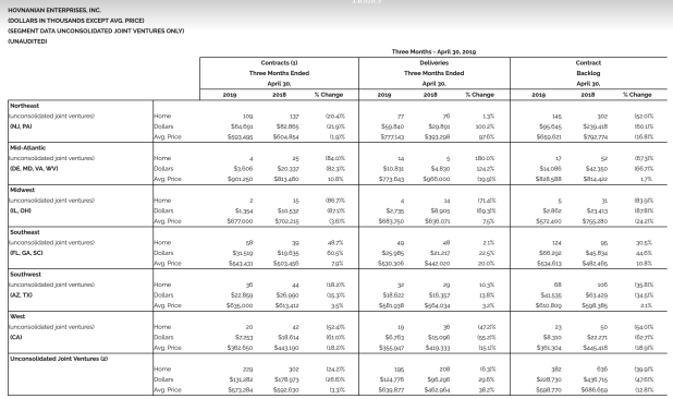 Hovnanian Enterprises (NYSE:HOV), Matawan, N.J. on Thursday before market open reported a net loss was $15.3 million, or $2.56 per common share, in the second quarter of fiscal 2019 compared with a net loss of $9.8 million, or $1.65 per common share, during the same quarter a year earlier. Analyst expectations were for a loss of $1.77 per share. Share of HOV were down almost 10% in mid-afternoon trading Thursday.
