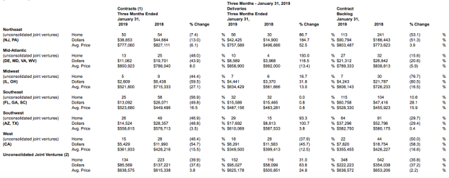 - For the quarter ended January 31, 2019, deliveries, including unconsolidated joint ventures, decreased 1.9% to 1,119 homes compared with 1,141 homes during the first quarter of fiscal 2018. Consolidated deliveries were 967 homes for the first quarter of fiscal 2019, a 5.7% decrease compared with 1,025 homes during the same quarter a year ago.