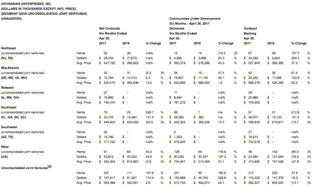 Consolidated net contracts per active selling community increased 18.5% to 10.9 net contracts per active selling community compared with 9.2 net contracts per active selling community in the second quarter of fiscal 2016. Net contracts per active selling community, including unconsolidated joint ventures, increased 14.4% to 10.3 net contracts per active selling community for the quarter ended April 30, 2017 compared with 9.0 net contracts, including unconsolidated joint ventures, per active selling community in last year’s second quarter.