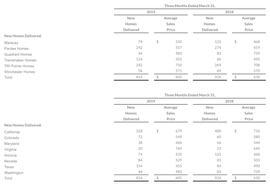 Home sales revenue decreased $89.9 million, or 15%, to $492.7 million for the quarter, compared to $582.6 million for the first quarter of 2018. The decrease was primarily attributable to a 12% decrease in new home deliveries to 814, compared to 924 in the first quarter of 2018, and a 4% decrease in the average sales price of homes delivered to $605,000, compared to $630,000 in the first quarter of 2018.