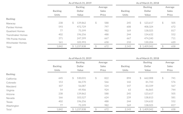 The company’s overall absorption rate per average selling community decreased 21% for the first quarter of 2019 to 8.9 orders (3.0 monthly) compared to 11.5 orders (3.8 monthly) during the first quarter of 2018. The company ended the quarter with 1,842 homes in backlog, representing approximately $1.2 billion. The average sales price of homes in backlog as of March 31, 2019 increased $14,000, or 2%, to $672,000, compared to $658,000 as of March 31, 2018.