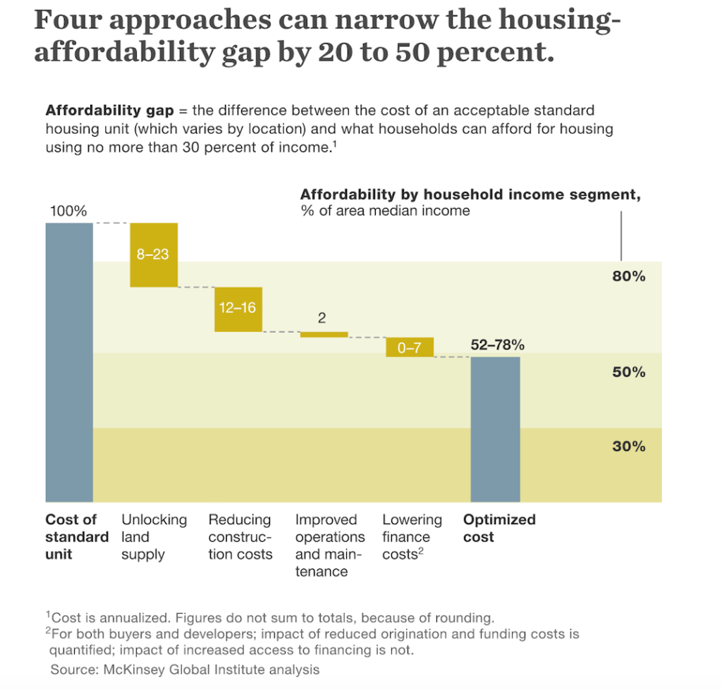 After laying out the scope of the housing affordability crisis–noting that the U.S. hasn’t a monopoly on the challenge by any means–McKinsey’s analysis says the fix is three things.