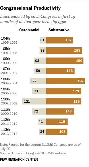 Pew Research Center’s Drew DeSilver comments that midway through its second and final year, the 113th Congress remains one of the least legislatively productive in recent history.