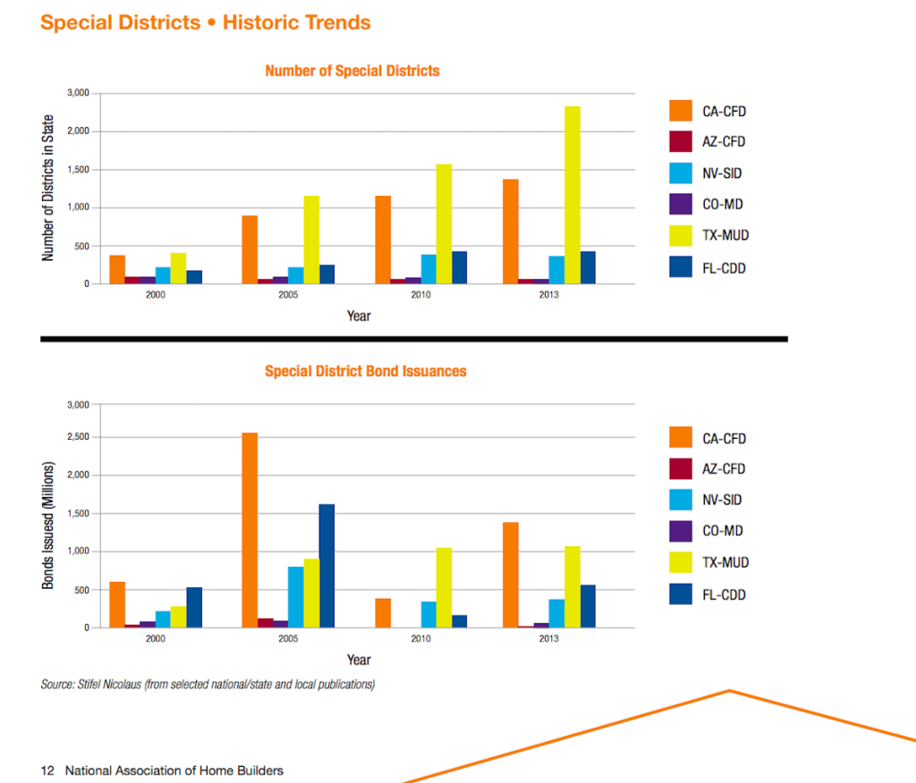 The National Association of Home Builders notes that special district financing involves the issuance of tax-exempt bonds to finance public improvements within a specified geographical area, or distrit… The bonds are repaid from the special taxes, assessments, and/or an ad valorem property tax imposed on the land within the district. The bonds are typically underwritten in private offerings managed by underwriting firms who specialize in this type of land-secured financing.