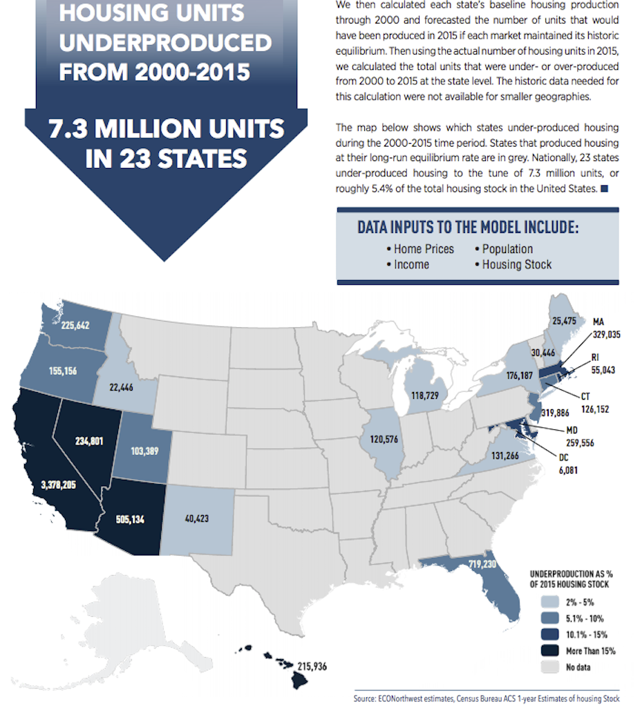 For more evidence of this, a new study released yesterday from the Up for Growth National Coalition, ECONorthwest, and Holland Government Affairs proposes to quantify the magnitude of the housing shortage for the duration 2000 to 2015. The math–which asserts that 7.3 million rental and for-sale units that did not get built during that 15-year period–suggests those “missing units” as the root cause of a host of big and growing challenges, both local and national. The report notes: