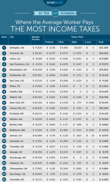 ● California and the D.C. metro area lead the way – All of the top five cities where the average worker pays the most in taxes are located in the D.C. metro area or in California. Workers in these cities take home big paychecks, on average, and pay fairly high state taxes. An Arlington, Virginia worker earning the median income, for example, would pay just over $21,200 in income taxes. While the average worker in Fremont, California would pay just under $19,300.