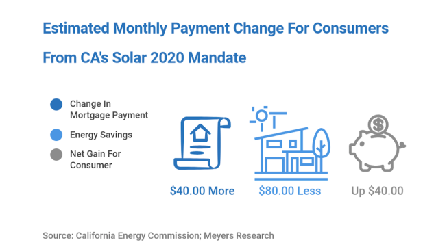 The 2020 mandate looks costly on the surface, especially for consumers who don’t place a high value on the technology, but adding solar panels is estimated to be a net gain for households (see the graphic above. Furthermore, unlike some regulatory fees that raise home prices without an obvious benefit, consumers can enjoy the utility of the solar panels.