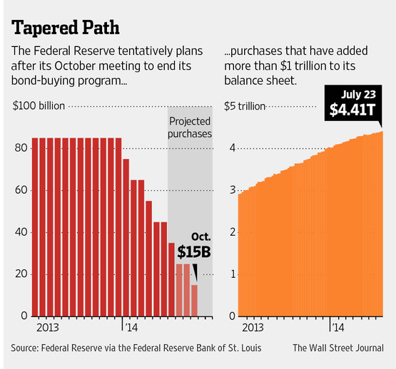 Wall Street Journal staffer Jon Hilsenrath reports that Federal Reserve officials will likely move closer to ending their purchases of mortgage and Treasury bonds at a policy meeting next week and discuss when and how to raise interest rates (paywall).