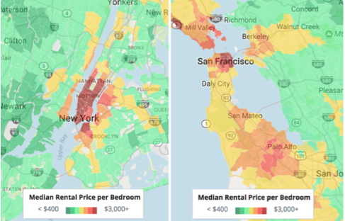 Take a look at the maps below. Both New York and San Francisco have expensive cores, with one bedroom units fetching rents of $3k+. But both also have less expensive areas, mostly across bodies of water. In New York, you can find a one bedroom in Bushwick for $1k per month. In the Bay Area, you can find similar deals in parts of the East Bay and pockets of the Peninsula.