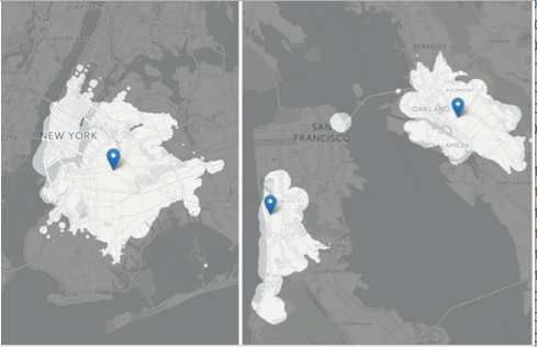 The next maps show places you can reach using public transportation within 45 minutes. If you live in Bushwick, you can access a large swathe of Manhattan and Brooklyn. In the Bay Area, you’re unlikely to have easy access to San Francisco at all if you’re not in San Francisco proper.