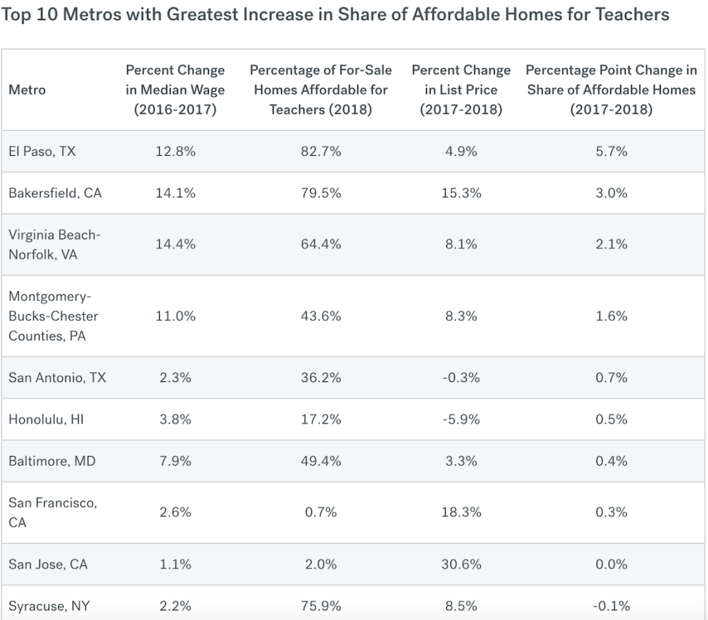 - Teachers are worse off or the same in 85 of the largest 93 metros, where the share of listings that teachers can afford decreased or held steady since this same time last year. And in the eight metros where the share of affordable listings increased, only four increased by more than 1 percentage point.