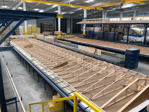 The first few minutes of the process starts as two team members at the roof assembly station use a self-propelled carrier to distribute ceiling board down the length of the two 36″ by 84″ by 84′ roof build tables. As that’s going on, another team member is busily using roller beds to transport fully-built trusses from a loading dock area to the station itself, which is a straight shot only a few feet away from where they come in by semi-trailer from one of Clayton Supply’s 17 component manufacturing plants around the nation, WoodPerfect, in Hillsboro, Tx, 90 miles west of Athens.