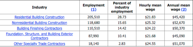 According to the Department of Labor’s Bureau of Labor Statistics, “carpenters construct, erect, install, or repair structures and fixtures made of wood, such as concrete forms; building frameworks, including partitions, joists, studding, and rafters; and wood stairways, window and door frames, and hardwood floors. May also install cabinets, siding, drywall and batt or roll insulation. Includes brattice builders who build doors or brattices (ventilation walls or partitions) in underground passageways.”