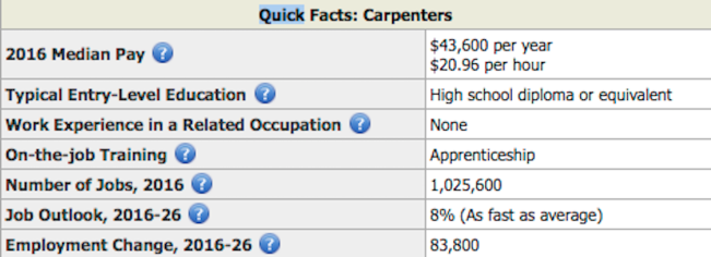 Now, according to Labor Department BLS data from 2016, there are about 1.025 million carpenter jobs in the U.S., spread across residential and non-residential industry sectors, and the median pay from that time clocked in at about $21 an hour, or about $43,600 a year. Most observers would say that carpenters–even ones that spent seven years learning the advanced skills of their craft, make an average upwards of $50,000. The National Association of Home Builders estimates job growth in residential carpentry of 6% by 2024, and says that by 2019, home building will need 1 million plus “craft” pros to bring labor capacity into stride with housing demand.