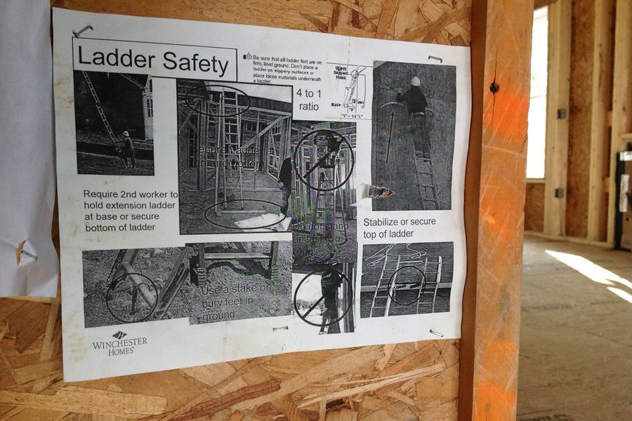 One way to improve the odds is to create a culture of workplace safety, and one step in that direction is to post safety sheets on the job. Here, Winchester Homes in southern Maryland has a ladder safety poster printed and tacked to the job board in the garages of the units.
