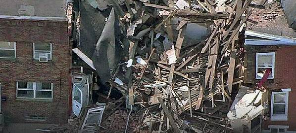 A South Philadelphia rowhouse exploded and collapsed in August 2013, sending eight people—including two infants–to the hospital and panicking neighbors who heard it from inside their homes. The blast destroyed three homes.