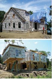 DROP AND ROLL: Early afternoon on July 12, the third box was hoisted into position (above). Two days later, the roof and dormers are up (below). Photos: Courtesy William Gloede The house could have been set then, but the manufacturer, KBS Building Systems of South Paris, Maine, had not yet started manufacturing the house. So the site sat idle for several weeks.