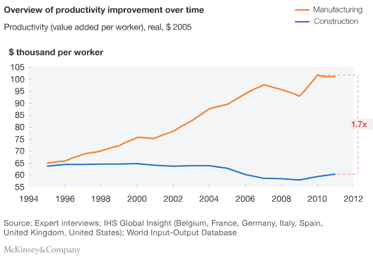 It matters, particularly now, as McKinsey & Co., the firm behind one of the most widely used images in home building and development business presentations of the past 24-months or so–showing construction sadly lagging broad manufacturing industry sectors in measures of business productivity–is out with a new report , new data, and a fresh assertion that “modular construction’s time may finally have come.”
