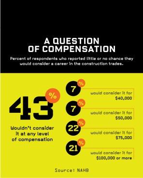 When the NAHB analyzed Quintâs survey data for a report, âYoung Adults & the Construction Trades,â it found what it calls âhelpful news.â Many of the 18- to 25-year-olds who in theory wouldnât work in the trades said they would reconsider if they could make $75,000 or more per year. While the report makes it clear that the average salary in the home building trades is well below that, the authors note that $75,000-plus salaries are available to the top 10% to 25% of workers. âIt may be worthwhile to make this more widely known,â they conclude.