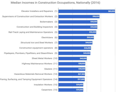 Using survey data from the 2016 American Community Survey, the study finds a wide range of median incomes by job, with elevator technicians making the most ($80,000), followed by supervisors ($58,000). Closing the list is the lowest paid occupation of construction trade helpers ($22,000). Here are the top 15 highest-paying jobs:
