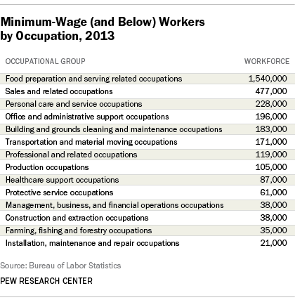 Perhaps surprisingly, not very many people earn minimum wage, and they make up a smaller share of the workforce than they used to. Here’s a breakout on some of the jobs.