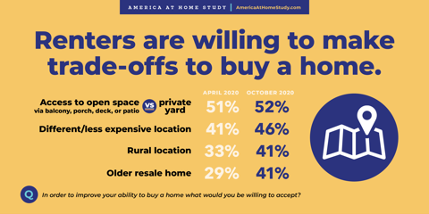 While COVID increased new-home demand on the part of renters, for many it also devastated their income and pushed that dream further out of reach. Knowing this, the America at Home Study asked renters what trade-offs they would make to be better able to afford a home. In both April and October, respondents were very willing to give up a private yard if it meant a greater ability to buyâ52% listed this as their top trade-off in October. In both waves, âaccess to open space via a balcony, porch, deck, or patio vs. having a yardâ was the highest ranked trade-off.