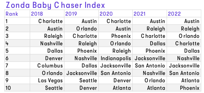Austin was the top baby chaser market again in 2022. Over the past five years, Austin has placed first three times (2019, 2021, and 2022).