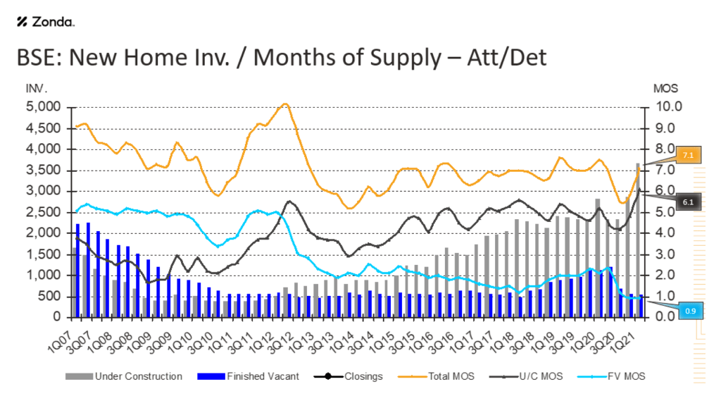 During the process of our quarterly lot-by-lot survey of every subdivision, Zonda tracks all new homes that are under construction and those that are finished and vacant (otherwise known as spec homes). An acceptable level of under construction inventory should range between six and nine months; currently there is a 7.1-month supply of new-home inventory in the Boise-Treasure Valley market, both attached and detached for-sale homes, which is at the lower end of equilibrium. One of the most important numbers we monitor is finished vacant inventory. The number of finished and vacant homes in the market has decreased 53% compared with this time last year and currently is a 0.9-month supply. As a reference, we consider this equilibrium to range between two-and-a-half to three months, therefore the current level is extremely low. While builders have tried to deliver more finished vacant homes to the market, they have struggled because consumers are buying these homes as fast as possible.