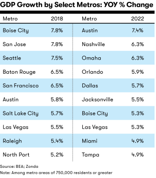 When drilling into the metro-level economic growth data, we see some of the shifts we’d expect. For example, prior to the pandemic, California had two metros in the top 10 for annual growth. The latest data shows none. Seattle was also in the top 10 but has since been bumped off the list.