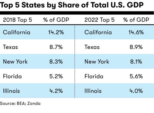 - California is still an economic powerhouse. Despite some high-profile corporate relocations from the state and some outbound migration, California actually gained share as a percent of total U.S. GDP since 2018. Texas and Florida have also gained share over the same period.