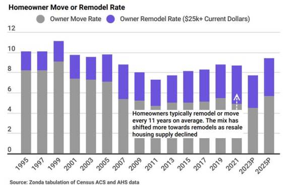 The industry is shifting: Homeowners historically either moved or undertook a major remodel every 11 years, but the mix has recently skewed toward remodels: 25 years ago, homeowners were 4:1 more likely to move, but today the mix is nearly equal, with homeowners choosing to move only 1.3 times per remodel. The reasons are mixed but are exacerbated by a low supply of available homes, a shift to older demographics, the lock-in effect from recent jump in mortgage rates, and a festering underlying shift to lower mobility the past 40 years (which I think may improve the next cycle, but that is a different research topic for another day). As a result, any change in remodel VOLUME has a larger impact on the overall supply/demand balance of materials versus new construction than it did during prior decades.