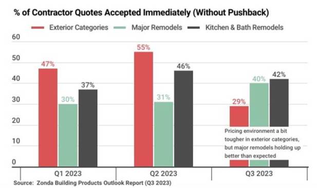 Major remodels are just starting to soften. We don’t expect the industry to sequentially shift until about mid-2024, albeit with notable differences by category. We gave our research clients notice last month that overall backlogs are down 10% to 15% from first quarter levels (recall that second quarter backlogs sequentially improved, so the pricing environment over the next three to six months will feel far different than it did this summer). Pro contractors report increased levels of pushback by their end consumers on exterior projects in the third quarter. Time will tell how the other categories perform.