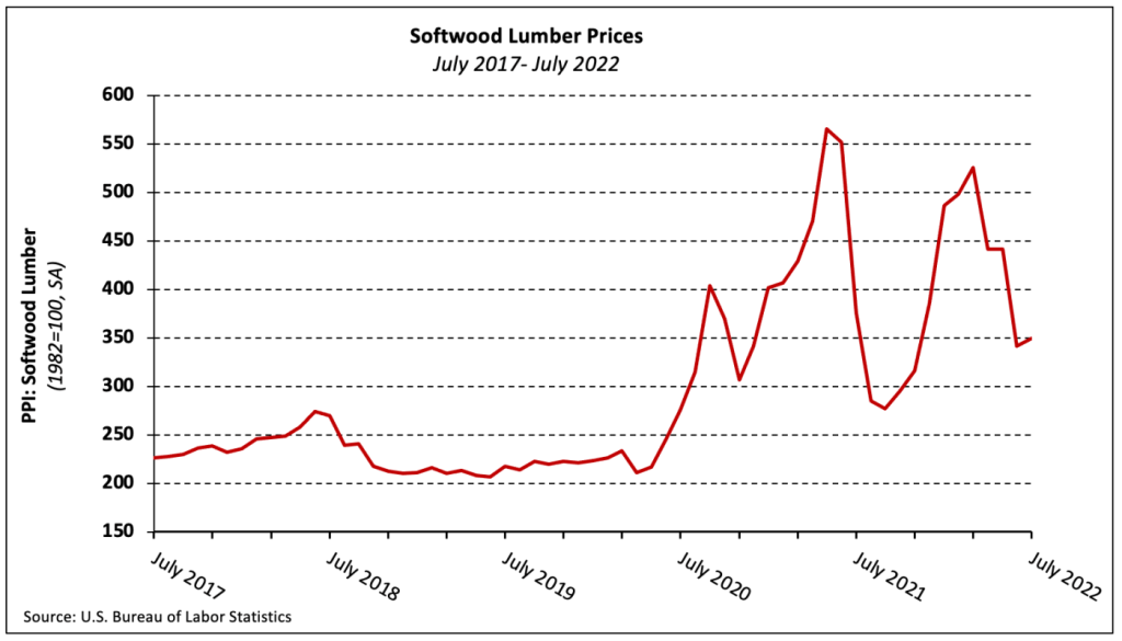 The PPI for softwood lumber (seasonally adjusted) saw a modest increase (+2.3%) in July, its second decline in three months. Prices have fallen 28.2% year-to-date, although the extent to which the decrease has reached home builders and remodelers is unclear.