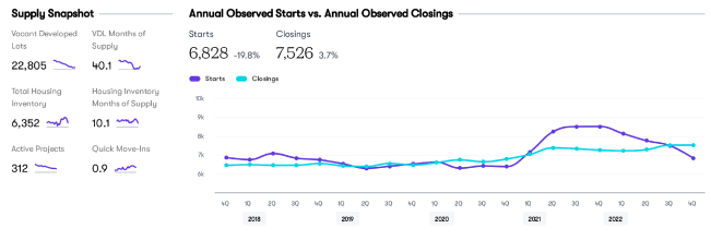 Fourth quarter housing starts decreased 34.8% from the previous year, while the number of available vacant developed lots sits at 22,805, down 3.6% from the same quarter in 2021. In terms of supply/demand balance, the market area is 3.58% oversupplied.