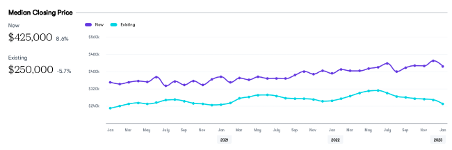 The average listed price for a new detached home in the Chicago-Naperville-Elgin region increased 7.7% from 2022 to $436,309 in February, while the average list price for a new attached home increased 25% over the same period to $594,701. Home prices under $250,000 experienced the most closing activity over the past year. The new-home affordability ratio for a detached home reached 30% in January.