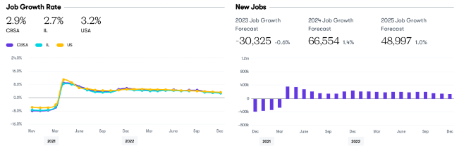 The population for the Chicago-Naperville-Elgin metropolitan area is 9,302,550 people. Population in the area is projected to decrease by 0.1% in 2023. There are approximately 3,639,050 households in the region, which is down 0.2% year over year. Forecasts show that current household formation is expected to increase by an annual growth rate of 0.3% by 2027. Incomes increased by 8.7% from the previous year to $88,920.