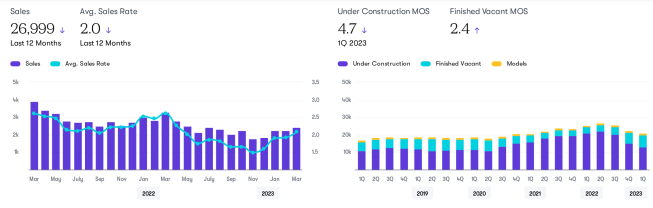 The average list price for a new detached home in the metro area increased 1.6.% from 2022 to $403,412 in March, while the average list price for a new attached home decreased 19.6% over the same period to $441,596. Homes priced under $250,000 experienced the most closing activity over the past year. The new-home affordability ratio for a detached home reached 40.5% in March.