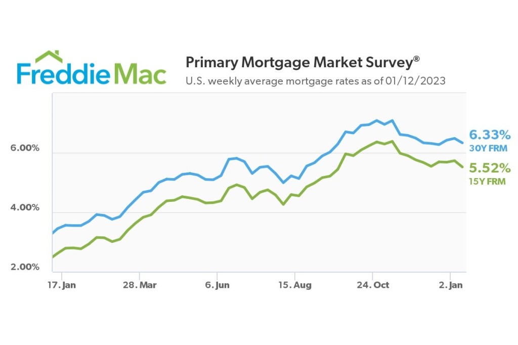 The results of Freddie Mac’s Primary Mortgage Market Survey shows the 30-year fixed-rate mortgage averaged 6.33% for the week of Jan. 12, down from the prior week when it averaged 6.48%. A year ago at this time, the rate averaged 3.45%.