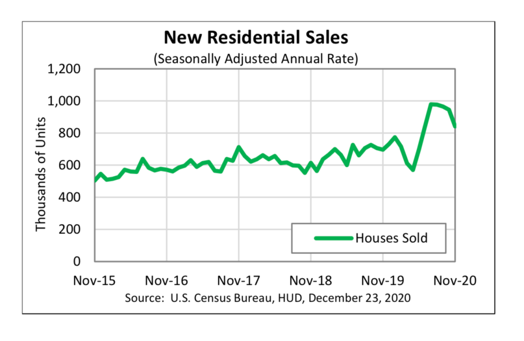 Estimates reveal that new-home sales were at a seasonally adjusted annual rate of 841,000 for November. This is down from the revised October rate of 945,000 and significantly above the November 2019 estimate of 696,000.