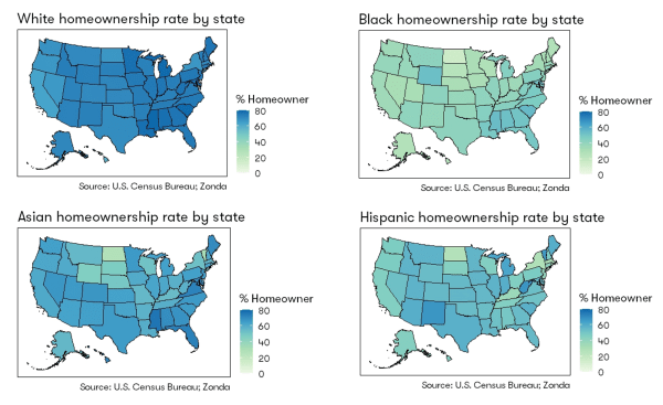 Below is a collection of graphs that show homeownership rates by racial group across the United States. All of the graphs are on the same scale for comparability.