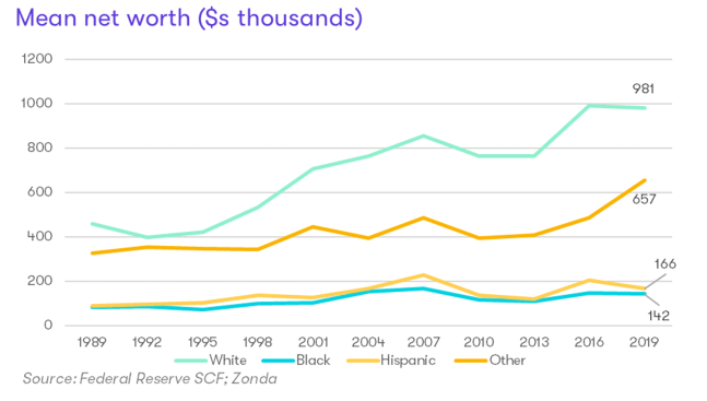 We can see the data from the Federal Reserve’s most recent Survey of Consumer Finances completed in 2019 (below), which shows clear differences by race: